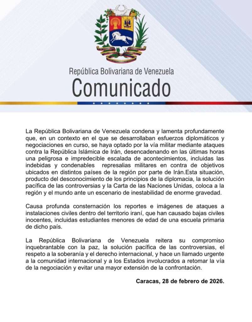 La República Bolivariana de Venezuela expresó mediante comunicado su condena a los ataques efectuados este sábado por Israel y Estados Unidos contra Irán.